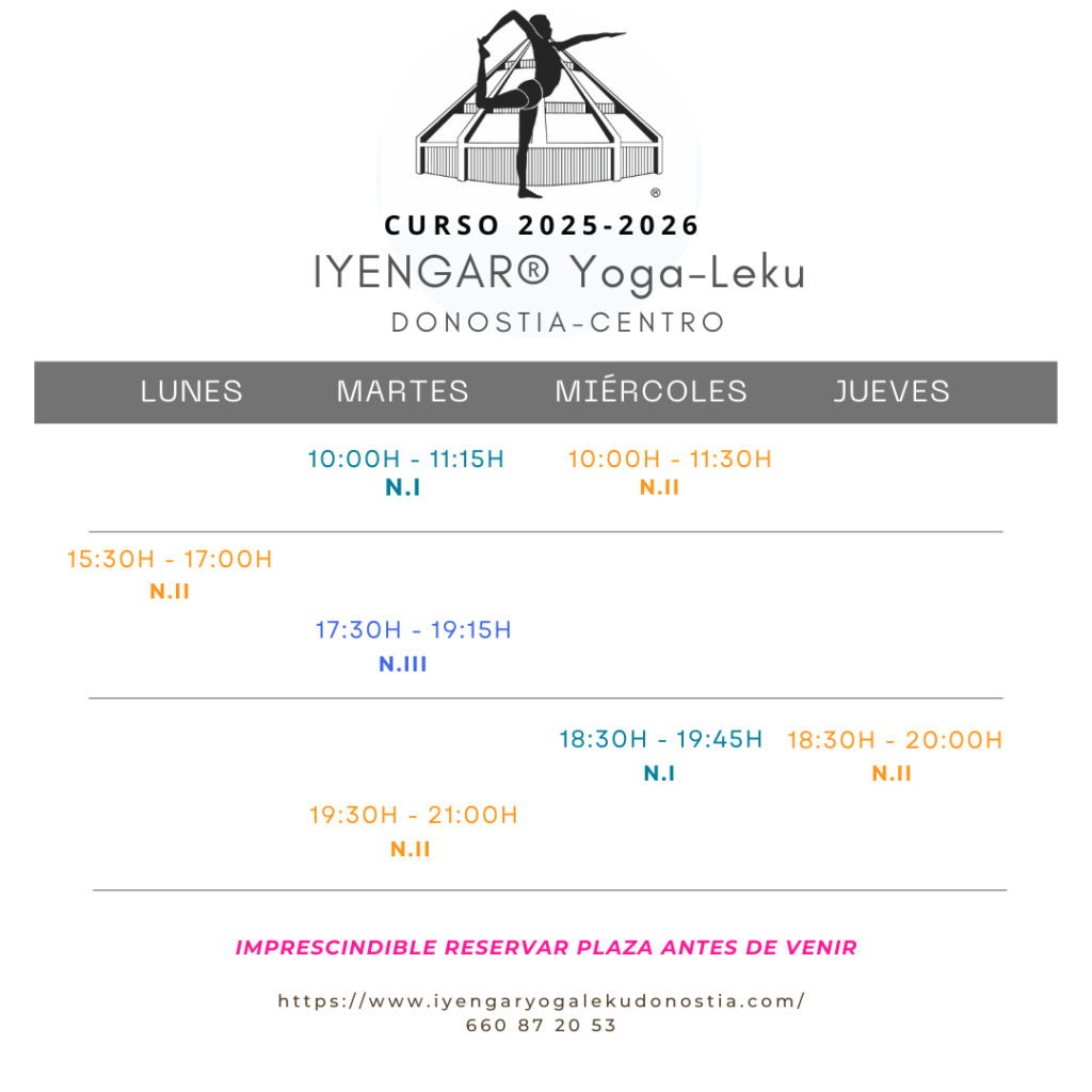 N.I: Dirigido a estudiantes que están comenzando en el Yoga, así como a aquellos que han practicado otros métodos de Yoga y quieren descubrir el método Iyengar. En realidad, los principios de movimiento y alineación que fundamentan el enfoque de BKS Iyengar pueden parecer nuevos para muchos practicantes y se introducen principalmente en los niveles iniciales. Es esencial haber asimilado estos fundamentos antes de considerar avanzar a cursos de nivel superior. Son clases de 1:15h.